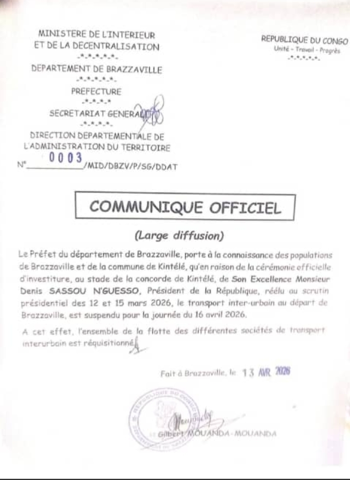 Gilbert Mouanda-Mouanda, préfet du département de Brazzaville, a confirmé une mesure exceptionnelle en lien avec la cérémonie d’investiture du président Denis Sassou N’Guesso. Dans une note officielle, les congolais ont été informés que le transport interurbain suspendu pendant toute la journée du 16 avril 2026.