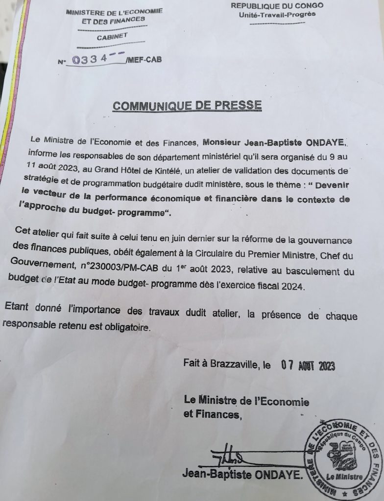 Le ministère de l’économie et des Finances organise du 9 au 11 août 2023 à Kintélé à 30km de Brazzaville, un atelier de validation des documents de stratégie et de programmation budgétaire sous le thème, » Devenir le vecteur de la performance économique et financière dans le contexte de l’approche du budget programme.